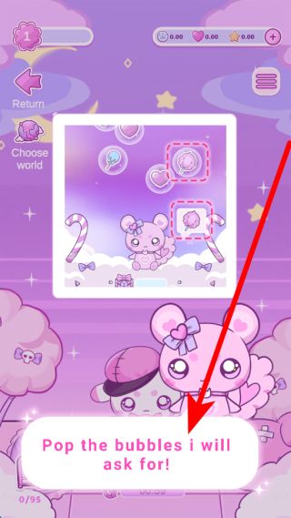 2、進(jìn)入游戲后,會有消除泡泡的環(huán)節(jié),按照提示去點(diǎn)擊相應(yīng)的泡泡,完成消除任務(wù),這一過程能為后續(xù)操作積累資源。