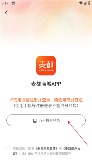 3、在登錄方式選擇頁(yè)面,點(diǎn)擊仍手機(jī)號(hào)登錄,進(jìn)入手機(jī)號(hào)登錄頁(yè)面。