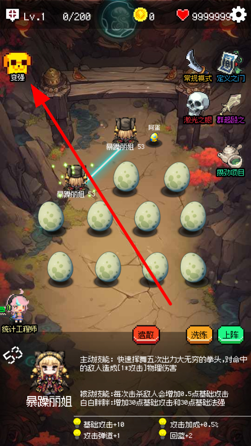 1、點(diǎn)擊變強(qiáng)選項(xiàng),進(jìn)入相關(guān)界面,可對(duì)角色的各項(xiàng)屬性或技能等進(jìn)行提升,為后續(xù)的戰(zhàn)斗與升級(jí)打好基礎(chǔ),讓角色更具戰(zhàn)斗力。