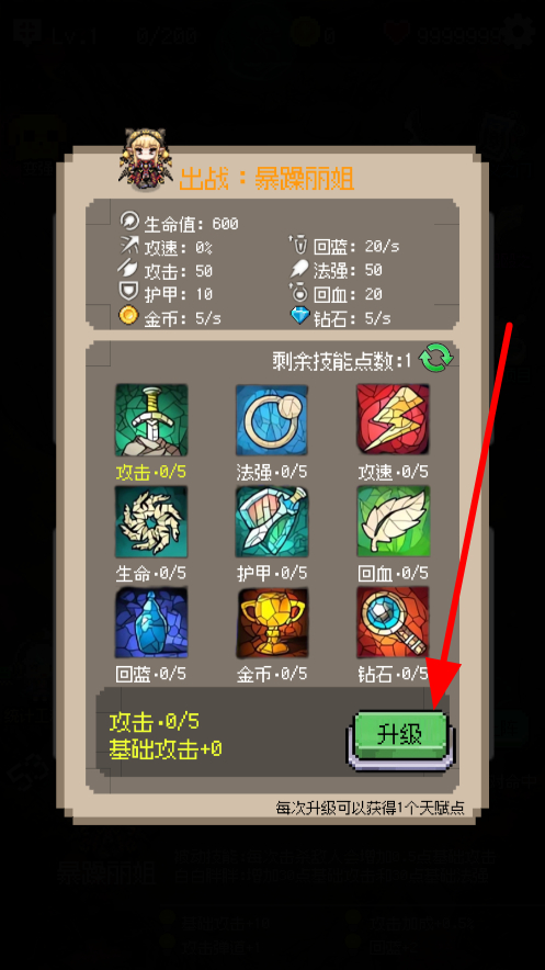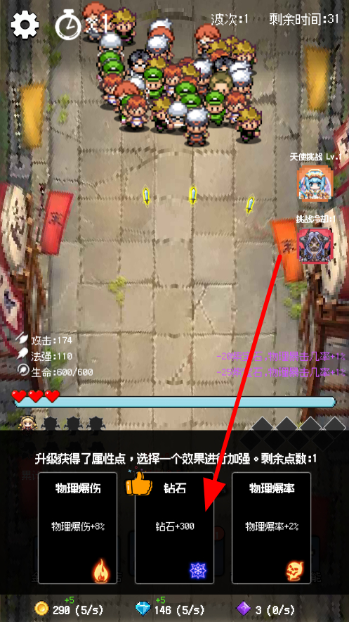 4、升級(jí)獲得屬性點(diǎn),會(huì)出現(xiàn)多個(gè)增益選項(xiàng),如物理爆傷、鉆石獎(jiǎng)勵(lì)、物理概率等,選擇其中一個(gè)效果加強(qiáng),進(jìn)一步提升角色實(shí)力。
