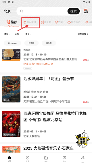 1、打開演出票務(wù)類應(yīng)用,點(diǎn)擊音樂演出分類,進(jìn)入音樂演出列表頁(yè)面。
