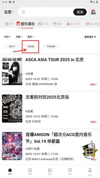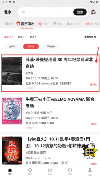 2、在音樂演出頁(yè)面,選擇周末場(chǎng)標(biāo)簽,篩選出周末的音樂演出。