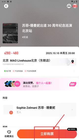 3、精準(zhǔn)演出搜索購(gòu)票:支持按音樂人、演出類型、城市等維度搜索目標(biāo)演出,找到后可直接在線完成購(gòu)票,流程簡(jiǎn)潔,為用戶節(jié)省時(shí)間成本。