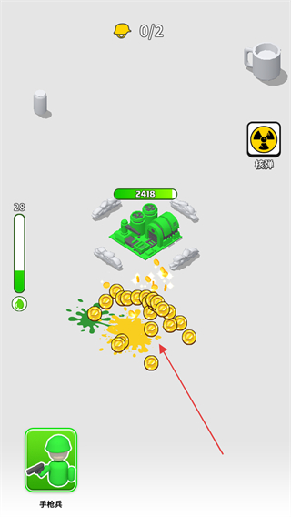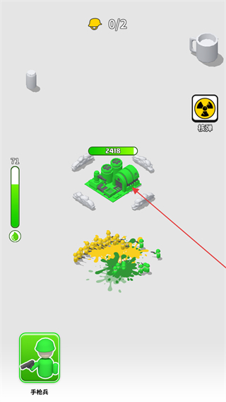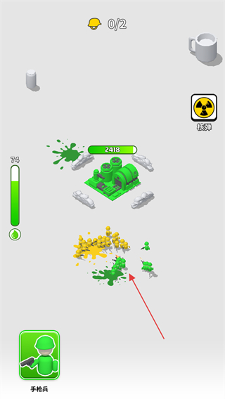 1、進(jìn)入游戲,屏幕左側(cè)有綠色的能量條,下方是手槍兵按鈕,可能用于召喚或升級(jí)兵種。操控綠色涂鴉士兵進(jìn)攻黃色敵人。