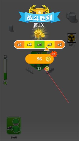 4、成功抵御敵人進(jìn)攻,保護(hù)建筑不被摧毀,完成關(guān)卡后,會(huì)顯示戰(zhàn)斗勝利,可選擇倍數(shù)領(lǐng)取金幣獎(jiǎng)勵(lì),然后進(jìn)入下一關(guān)。