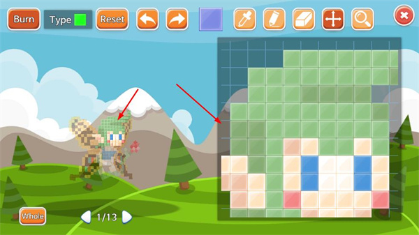 1、在角色編輯界面,可對(duì)像素角色的外觀進(jìn)行設(shè)計(jì),通過不同的像素方塊組合。