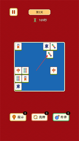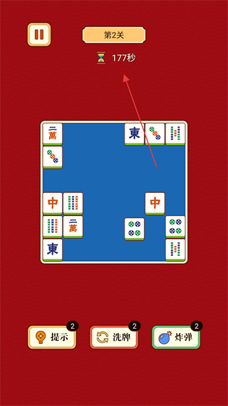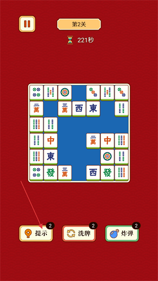 1、進(jìn)入第2關(guān),查看界面下方提示,洗牌,炸彈道具,限時221秒開始游戲。