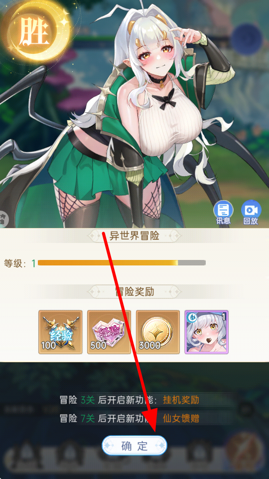 2、戰(zhàn)斗勝利后,會(huì)彈出勝利結(jié)算界面,此時(shí)點(diǎn)擊確定,領(lǐng)取冒險(xiǎn)獎(jiǎng)勵(lì),這些獎(jiǎng)勵(lì)包含經(jīng)驗(yàn)、道具等,能助力成長。