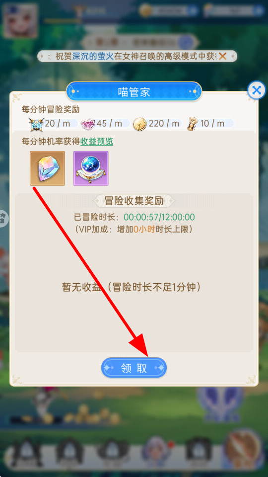 3、喵管家界面查看冒險(xiǎn)時(shí)長與對應(yīng)的物品獎(jiǎng)勵(lì),當(dāng)滿足領(lǐng)取條件時(shí),點(diǎn)擊領(lǐng)取,獲取相應(yīng)的冒險(xiǎn)獎(jiǎng)勵(lì)收益。
