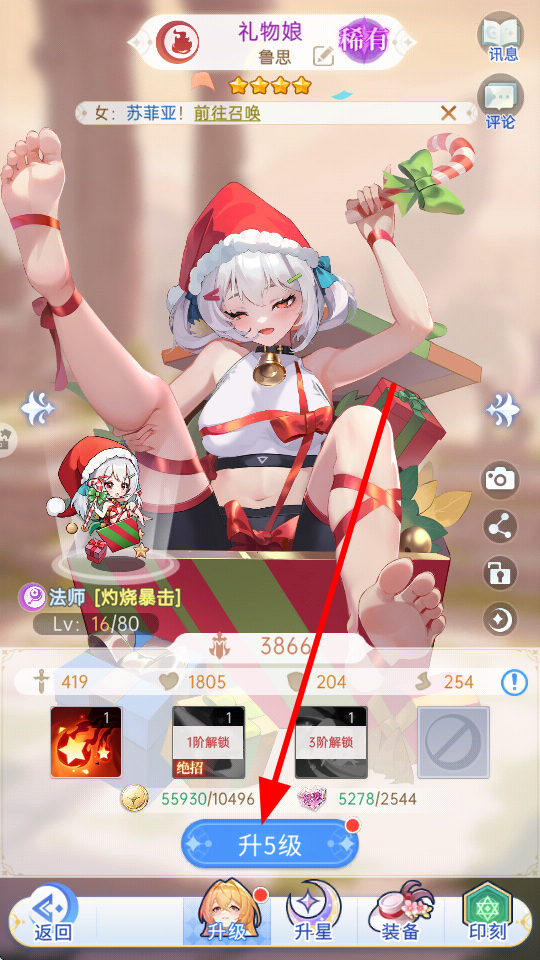 4、角色界面,若有足夠的資源,點(diǎn)擊升5級(jí)等升級(jí)按鈕,提升角色等級(jí),增強(qiáng)角色的各項(xiàng)能力,更好的冒險(xiǎn)與戰(zhàn)斗。