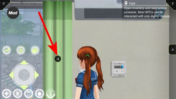 2、在校園室內(nèi)場景中,看到綠色窗簾時,可點擊窗簾旁的交互按鈕,和窗簾進行互動,這是探索校園場景、觸發(fā)可能互動的一種方式,能讓玩家更深入感受校園環(huán)境。