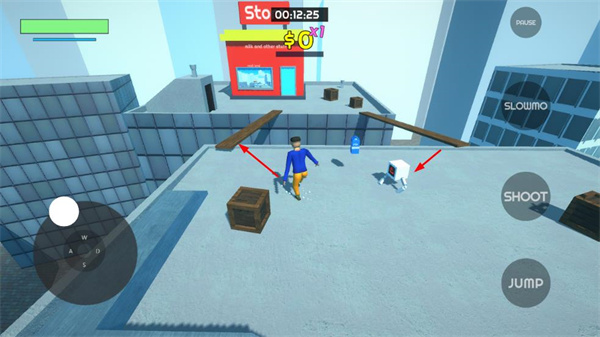 3、在屋頂?shù)葏^(qū)域,可利用場景中的木板等道具,以及右側(cè)的JUMP按鈕進行跳躍,跨越障礙,同時還能與場景中的其他物體互動。