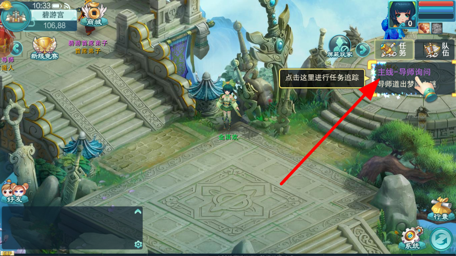 2、場景中,玩家可以點擊任務(wù)追蹤,跟隨主線任務(wù)指引,與導(dǎo)師等互動,推進劇情,逐步了解游戲世界與玩法。