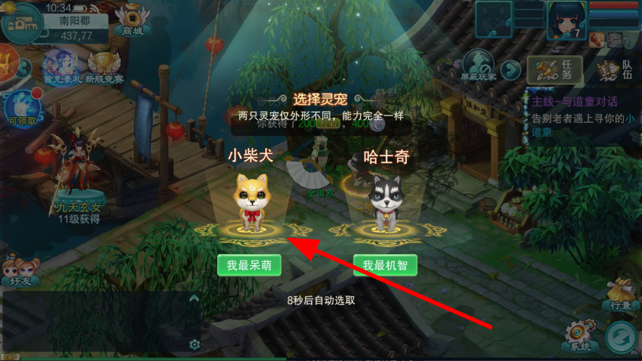4、靈寵領(lǐng)取選擇界面,根據(jù)自己喜好,從小柴犬、哈士奇等靈寵中挑選,讓靈寵陪伴自己繼續(xù)仙俠冒險。