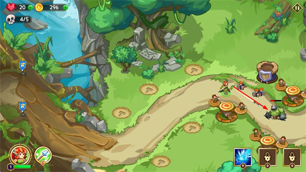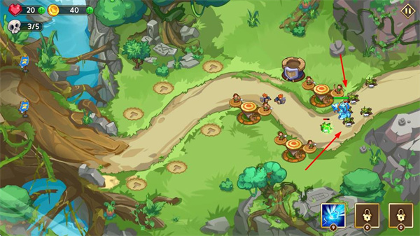 1、在卡通風(fēng)格的森林場景中,布置防御塔在道路旁的空位上,阻擋敵人的前進(jìn)。
