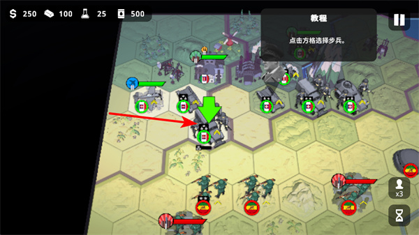 1、點擊方格選擇步兵單位,步兵是基礎(chǔ)作戰(zhàn)單位,可用于占領(lǐng)區(qū)域和對抗敵方部隊,前期兵力部署關(guān)鍵。