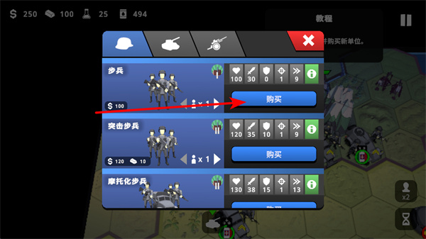 2、在單位購買界面,選擇步兵點擊購買,根據(jù)資源情況合理補充兵力,確保單位數(shù)量充足,支撐推進(jìn)。