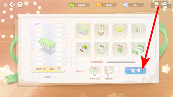 3、接著可制作家具,選擇想要制作的家具,準(zhǔn)備好所需材料后點擊制作,制作完成的家具可用于裝飾家園。
