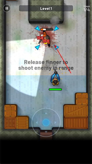 2、操控角色在有木箱等障礙物的場景中移動,躲避敵人的攻擊,同時尋找合適的射擊角度,攻擊敵人。