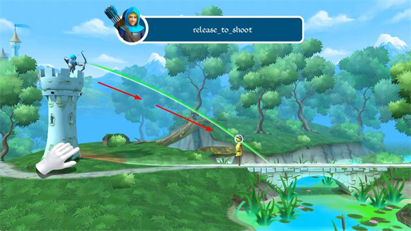 1、操控弓箭手,通過釋放操作發(fā)射箭矢,瞄準并射擊敵人,箭矢會沿拋物線軌跡飛行,擊中敵人造成傷害。