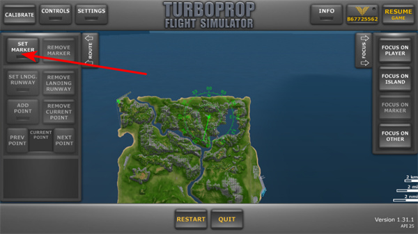 3、點擊SET MARKER,在地圖上設置標記點,規(guī)劃飛行路線,便于在復雜地形中導航,提升飛行任務的完成效率。