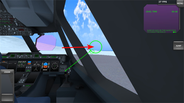 4、觀察外部視角,通過駕駛艙舷窗觀察外部環(huán)境,結合儀表盤信息,調整飛機飛行姿態(tài),確保飛行安全任務推進。