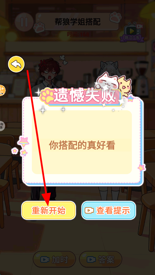 4、若搭配失敗,出現(xiàn)遺憾失敗提示時(shí),可點(diǎn)擊重新開(kāi)始按鈕,再次嘗試為角色進(jìn)行裝扮,直至成功。