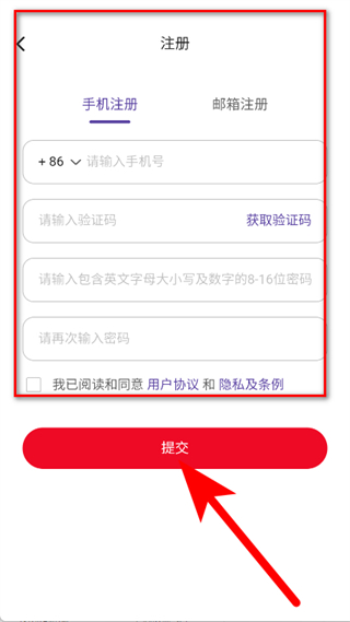 4、選擇手機(jī)注冊(cè)方式,依次輸入手機(jī)號(hào)、獲取并填寫(xiě)驗(yàn)證碼,勾選后,點(diǎn)擊提交完成注冊(cè)。
