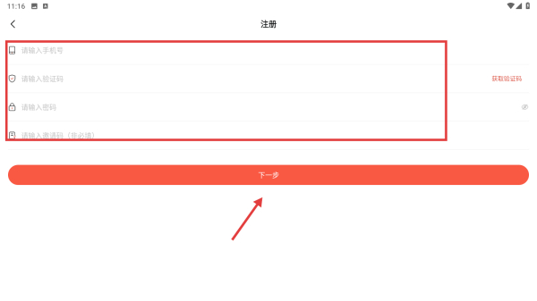 4、在注冊頁面,依次輸入手機(jī)號碼、驗證碼、密碼、邀請碼,勾選同意協(xié)議后,點擊下一步按鈕,完成賬號注冊操作。
