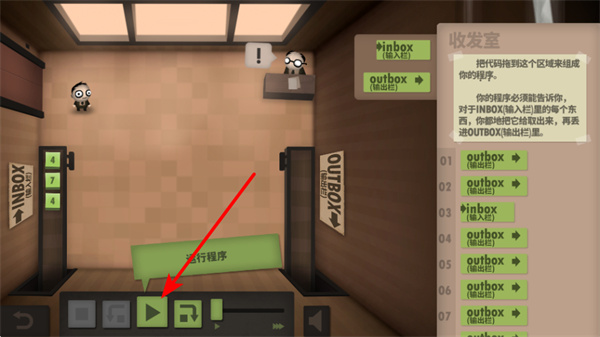 2、點擊運行程序按鈕,執(zhí)行編寫的程序,使角色按照程序指令在收發(fā)室中處理物品,推進任務進程。