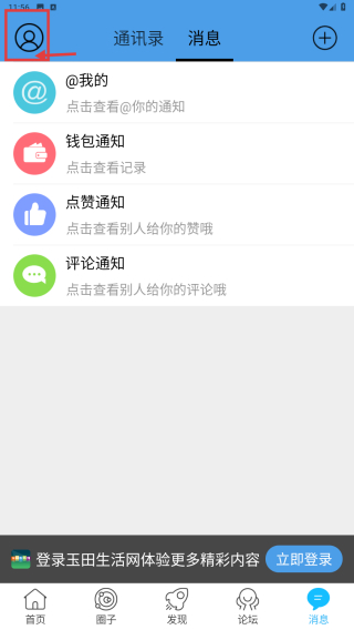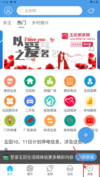 1、打開玉田生活網(wǎng)應(yīng)用,點(diǎn)擊底部消息選項(xiàng),進(jìn)入消息頁面。