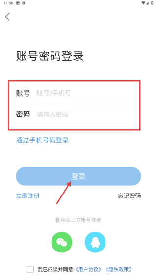 4、在登錄頁面,輸入賬號(hào)手機(jī)號(hào)和密碼,點(diǎn)擊登錄按鈕,完成賬號(hào)登錄操作。