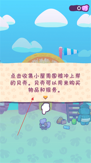 1、進(jìn)入游戲,根據(jù)提示點(diǎn)擊收集小屋周?chē)粵_上岸的貝殼,屏幕右上方會(huì)顯示貝殼數(shù)量。