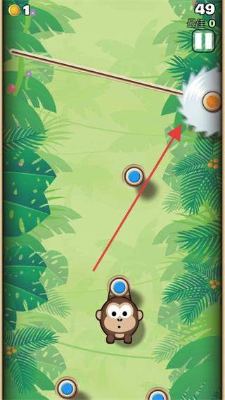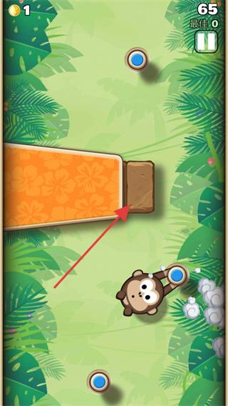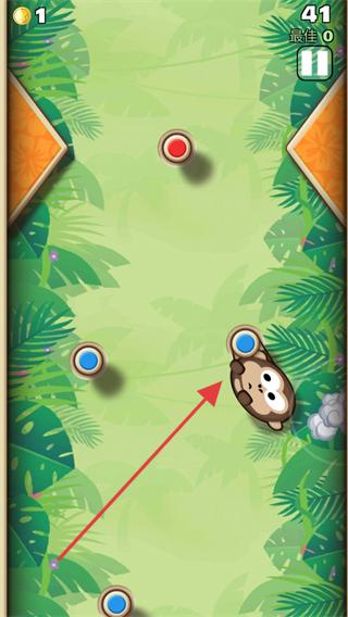 1、進入游戲,操控小猴子移動,讓小猴子觸碰藍色圓點,借助圓點反彈向上移動,避開紅色圓點。