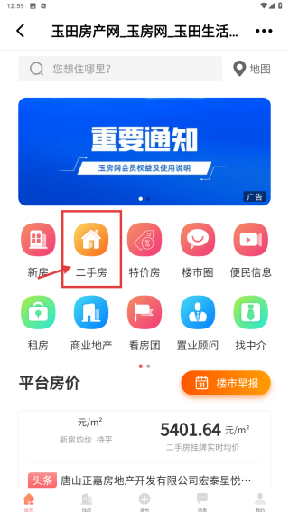 1、打開玉房網(wǎng)應(yīng)用,點(diǎn)擊玉房網(wǎng)功能入口,進(jìn)入房產(chǎn)服務(wù)頁面。