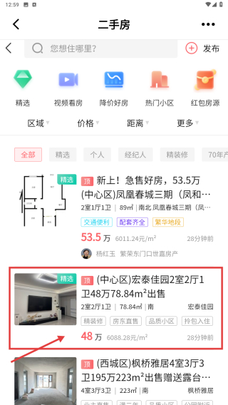 3、在二手房列表里,找到中心區(qū)宏泰佳園2室2廳1衛(wèi)房源條目,點(diǎn)擊進(jìn)入詳情。
