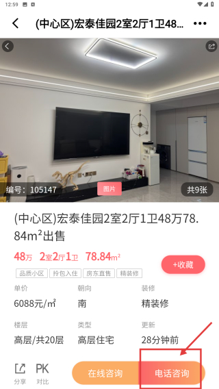 4、在房源詳情頁,點(diǎn)擊電話咨詢按鈕,發(fā)起房源咨詢操作。