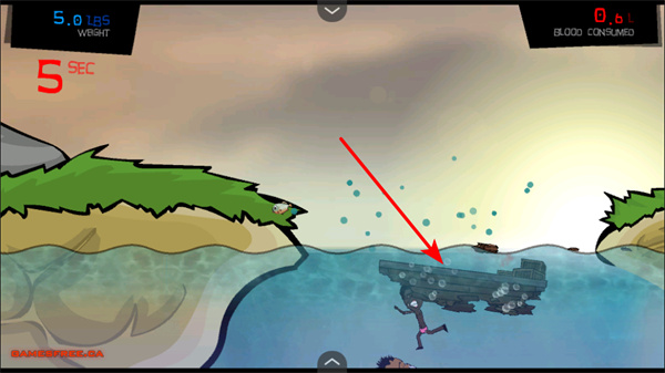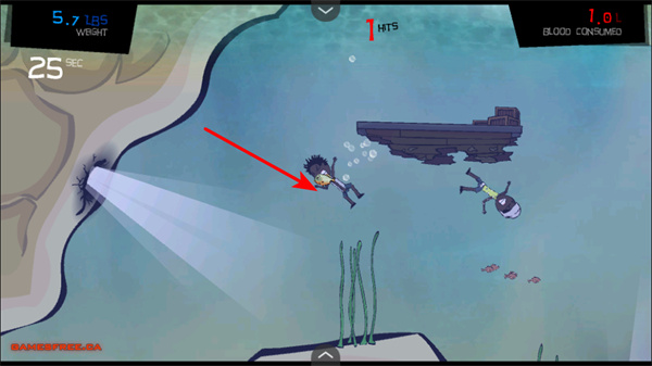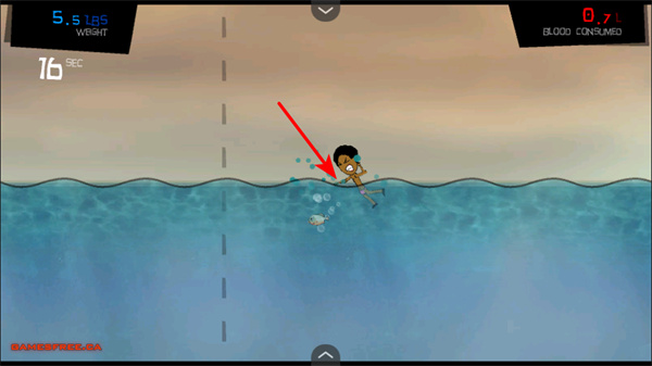 3、捕食小魚,控制角色捕食水域中的人類,積累體重,可能獲得血液資源,用于升級(jí)。