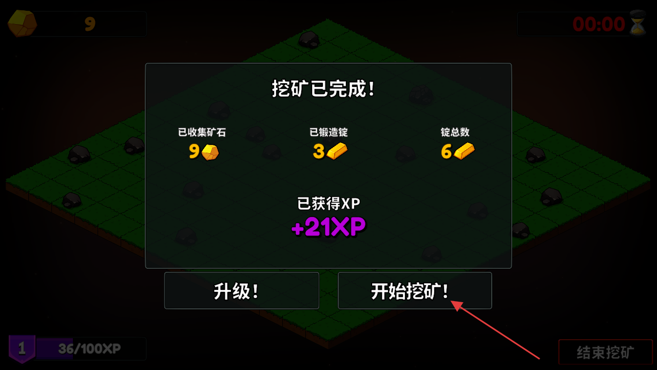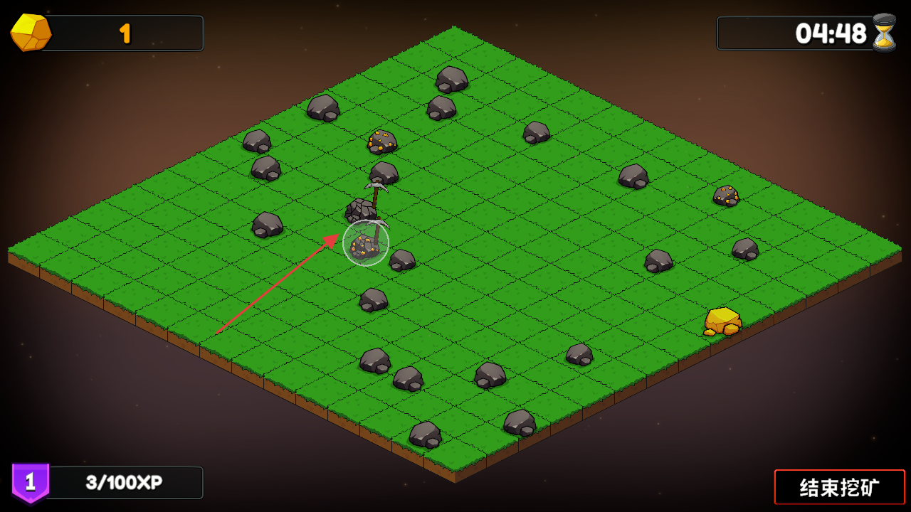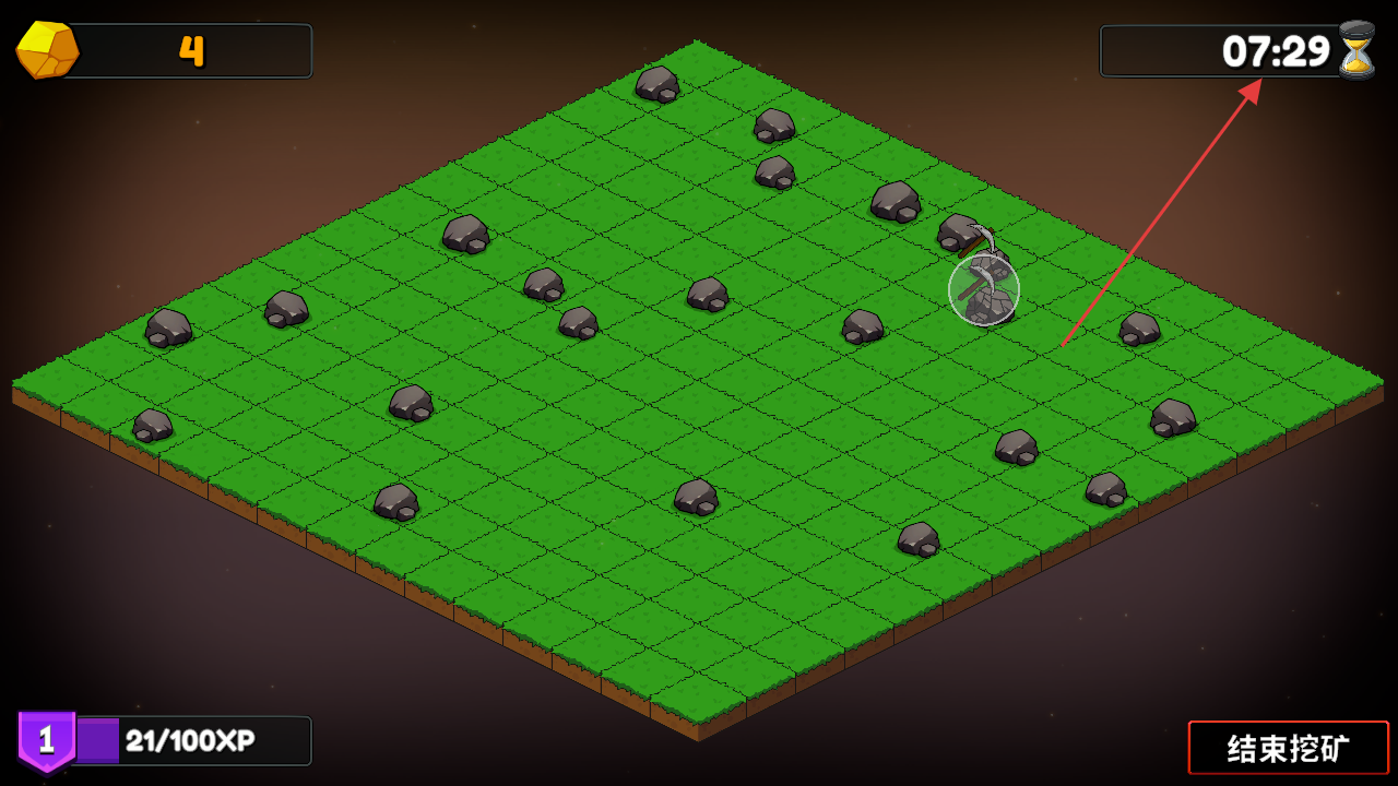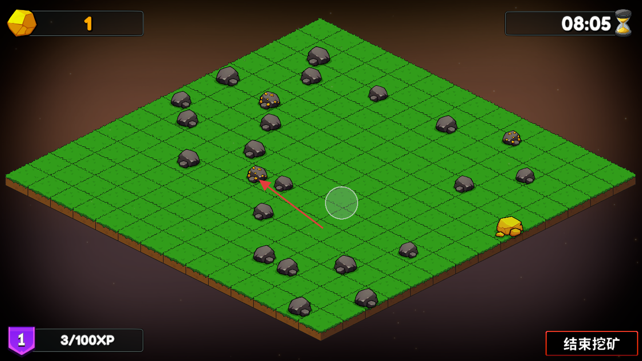 1、進(jìn)入游戲,左上角1是當(dāng)前礦石數(shù)量,留意右上角倒計(jì)時(shí),如08:05,在時(shí)間限制內(nèi)挖掘。