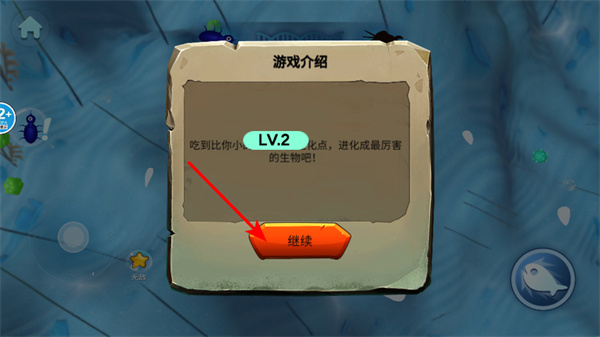 1、點擊繼續(xù),進入游戲介紹后的操作環(huán)節(jié),繼續(xù)推進蟲子進化的冒險的進程。