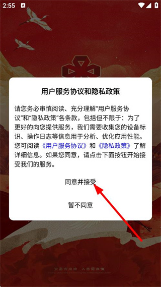 1、在用戶服務(wù)協(xié)議和隱私政策彈窗中,點(diǎn)擊同意并接受,進(jìn)入應(yīng)用。