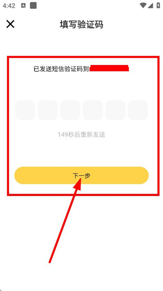 4、在填寫驗(yàn)證碼頁面,輸入收到的驗(yàn)證碼后,點(diǎn)擊下一步,完成注冊流程。