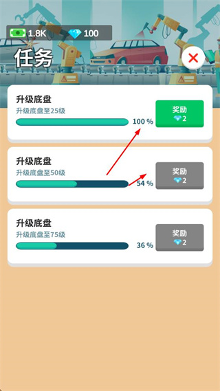 2、完成升級(jí)底盤的任務(wù),可獲得鉆石獎(jiǎng)勵(lì),任務(wù)進(jìn)度達(dá)到100%時(shí)即可領(lǐng)取獎(jiǎng)勵(lì)。