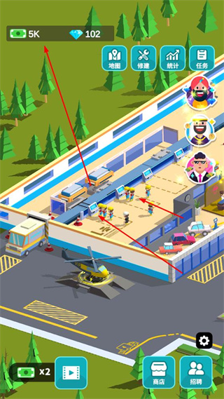 3、會(huì)顯示工廠的整體場(chǎng)景,有車輛、工人等元素,通過(guò)經(jīng)營(yíng)工廠,積累貨幣和鉆石資源,可用于工廠的建設(shè)和升級(jí)。