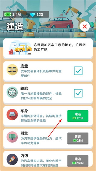 4、可建造汽車的不同部件,如底盤、輪胎、車身、引擎、內(nèi)飾等,建造車身需花費(fèi)120K貨幣,引擎需23M貨幣,內(nèi)飾需260M貨幣等。