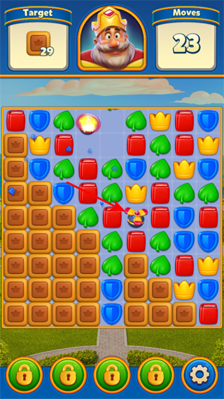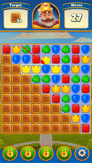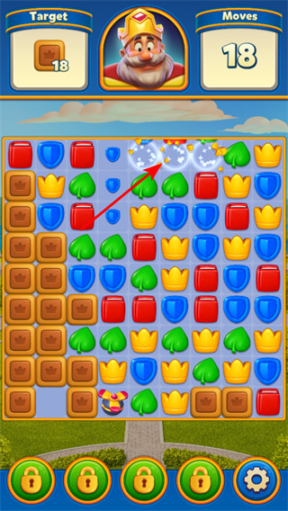 1、匹配同色元素,將相同顏色的皇冠,盾牌等元素進(jìn)行匹配消除,這是用于清理方塊完成目標(biāo)。