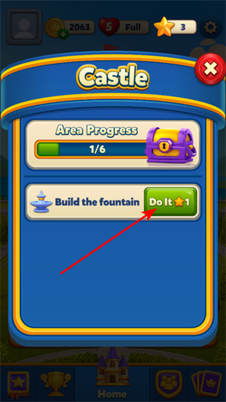 3、完成區(qū)域進(jìn)度,通過(guò)持續(xù)消除方塊,推進(jìn)城堡區(qū)域進(jìn)度如從1/6逐步完成,解鎖新區(qū)域和獎(jiǎng)勵(lì)。
