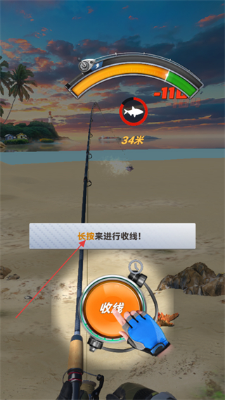 2、當(dāng)出現(xiàn)長按來進(jìn)行收線!提示后,點擊并長按收線按鈕,開始收釣魚線。