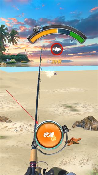 3、收線過程中,留意上方的進(jìn)度條和魚的圖標(biāo),調(diào)整收線節(jié)奏,避免魚逃脫。