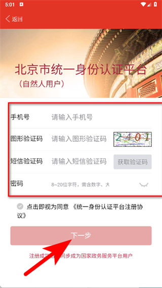 4、依次填寫手機(jī)號(hào)、短信驗(yàn)證碼、密碼后,點(diǎn)擊下一步,完成注冊(cè)。